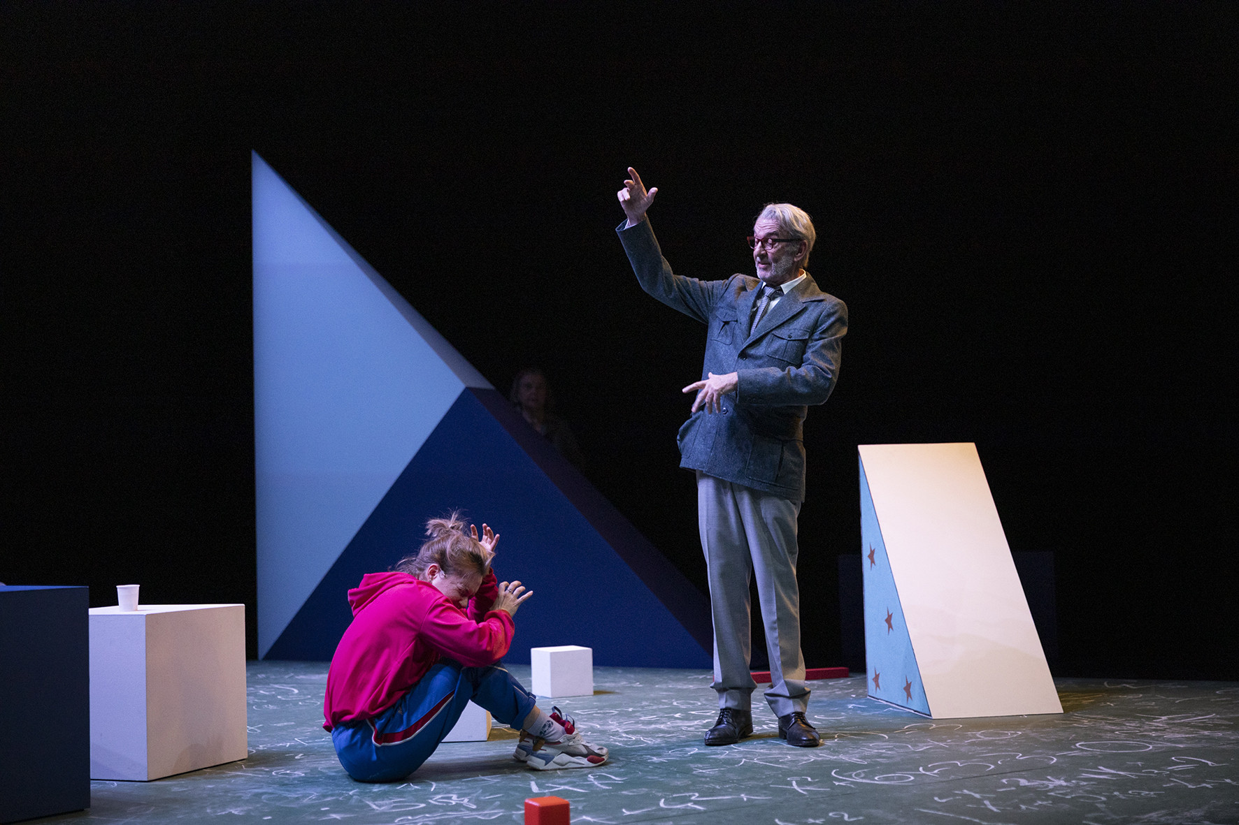 Comment faire acte de partage des connaissances et créer du désir d’apprendre ? C’est d’abord la notion de transmission qui aura conduit Robin Renucci à raviver La Leçon. Dans ce texte écrit en 1950, le savoir est imposé. Un professeur reçoit une élève. Lui, écrit Ionesco, est d’abord « excessivement poli et très timide », tandis qu’elle, est « bien vivante, gaie dynamique ». Mais à mesure qu’il l’interroge sur la géographie, l’arithmétique, la linguistique, l’homme entre dans un délire langagier qui devient instrument de torture. La jeune fille est chosifiée, manipulée, abusée et finalement anéantie.